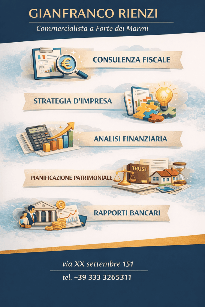 Gianfranco Rienzi a Forte dei Marmi apre un nuovo studio professionale di consulenza contabile e aziendale, con sede in via XX Settembre 151. La nuova realtà opera nel campo della consulenza contabile, fiscale, societaria e del lavoro, rivolgendo i propri servizi a imprese, professionisti e privati che necessitano di un’assistenza strutturata nella gestione delle attività economiche e patrimoniali.